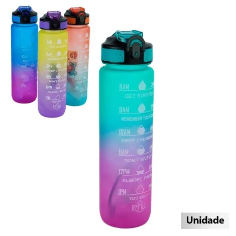 Squeeze de plástico com bico flip, tampa com trava, canudo, adesivos 2D e 3D e alça para transporte.